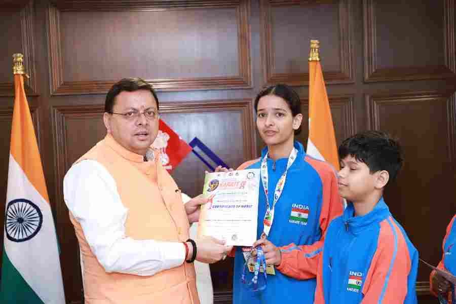 मुख्यमंत्री पुष्कर सिंह धामी ने मंगलवार को नई दिल्ली में राज्य के तीन होनहार कराटे चैंपियन्स को सम्मानित किया। मुख्यमंत्री ने कहा कि सम्मानित किए जा रहे सभी प्रतिभाशाली खिलाड़ी राज्य के उज्ज्वल भविष्य की नींव हैं। उन्होंने कहा, इन खिलाडियों ने अपनी खेल प्रतिभा से अपने माता-पिता के साथ ही उत्तराखंड का मान भी बढ़ाया है। तीनों खिलाड़ियों अनामिका, मैत्री व क्रियांश ने 5-6 जुलाई 2025 को कोलंबो, श्रीलंका में आयोजित 9वीं साउथ एशियन कराटे चैंपियनशिप में भारत का प्रतिनिधित्व करते हुए रजत, कांस्य व कांस्य पदक जीते है, मुख्यमंत्री ने इन खिलाडियों के उज्जवल भविष्य की कामना की तथा भविष्य के आयोजनों में सफलता के लिये शुभकामनाएं भी दी।