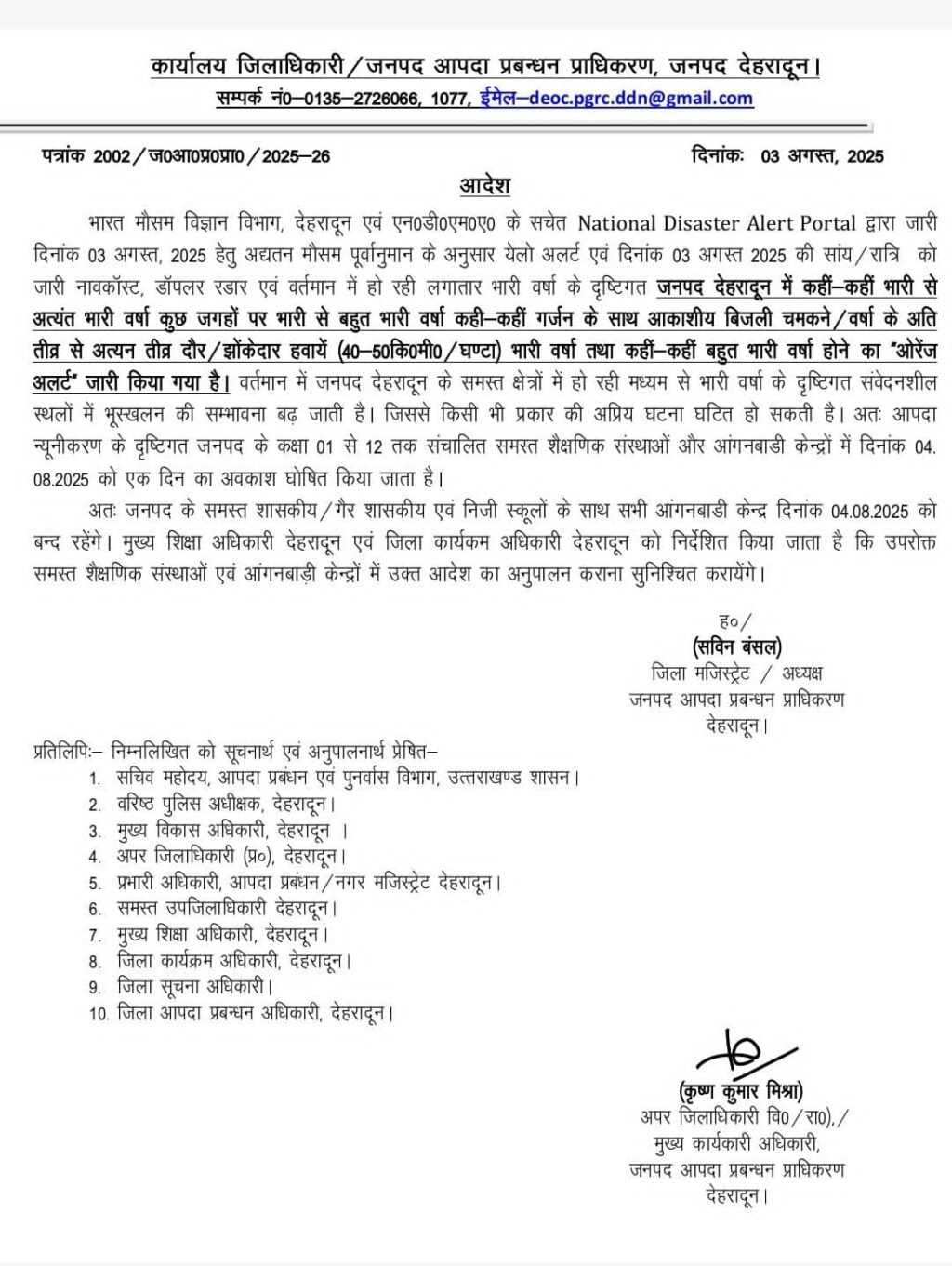 मौसम विभाग में आज देहरादून समेत प्रदेश के विभिन्न जनपदों के लिए भारी बारिश का जारी किया है और ऑरेंज अलर्ट