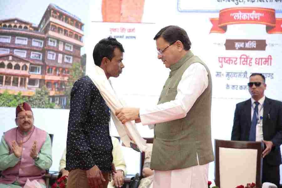 उत्तराखंड निवास के निर्माण में अपना महत्वपूर्ण योगदान देने वाले श्रमिकों को शॉल ओढ़ाकर मुख्यमंत्री ने किया सम्मानित