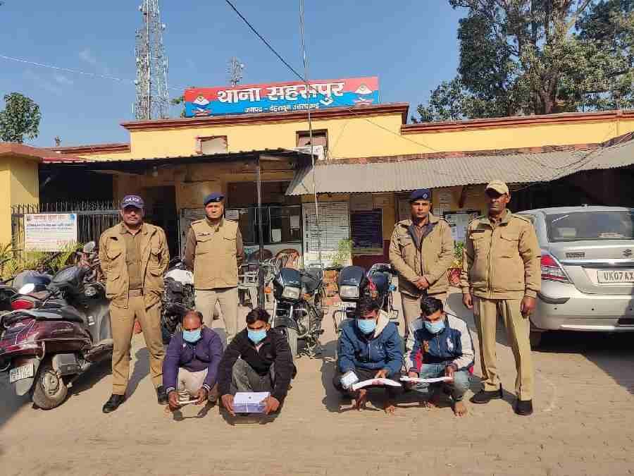 इसी क्रम में एसएसपी देहरादून को गोपनीय माध्यमों से पश्चिमी उत्तर प्रदेश में ठगी की कई घटनाओं को अंजाम देने वाले ठग गिरोह के कुछ सदस्य के देहरादून में आने तथा किसी बड़ी घटना का अंजाम देने की फिराक में सहसपुर क्षेत्र में छुपे होने की सूचना प्राप्त हुई। के आस पास के क्षेत्र में उक्त सूचना पर एसएसपी देहरादून द्वारा प्रभारी निरीक्षक सहसपुर को तत्काल प्रभावी कार्यवाही करने हेतु निर्देशित किया गया, जिस पर थाना सहसपुर में पुलिस की अलग-अलग टीमें गठित कर थाना क्षेत्र में अलग-अलग स्थानों पर सघन चेकिंग अभियान चलाया गया। अभियान के दौरान पुलिस टीम द्वारा सभावाला से सहसपुर की ओर जाने वाले रास्ते पर निर्माणाधीन हाइवे मार्ग पर सुनसान स्थान पर चोरी की योजना बनाते 04 अभियुक्तों 1- सुमित गौतम, 2- विकास 3- रमेश गौतम तथा 4- मोनू कुमार को एक तमंचा 01 जिन्दा कारतूस, 01 चाकू, 02 खुखरी व 27 एटीएम कार्ड तथा 02 मोटरसाईकिलों सहित गिरफ्तार किया गया। अभियुक्तो के विरुद्ध थाना सहसपुर पर मु0अ0सं0 – 353/2024 धारा 313 बीएनएस व 3/4/25 आयुध अधिनियम के तहत अभियोग पंजीकृत किया गया।
